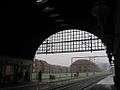 - Nørrebro Station seen from one platform under the large curved roof