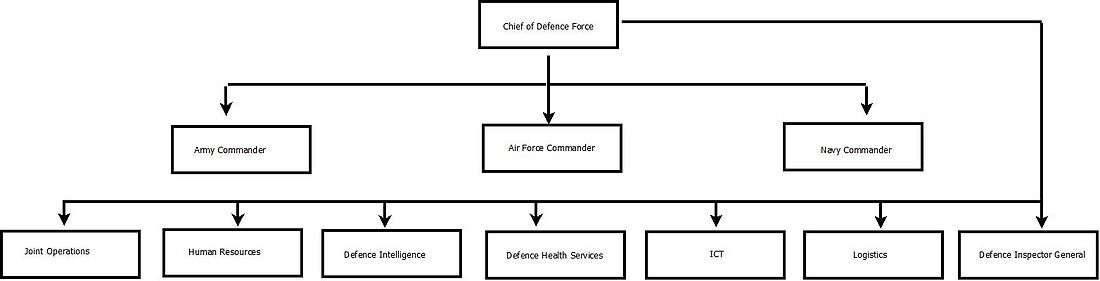 The Chief Of Defence Force is the highest-ranking officer and exercises overall executive command of the force. Service Chiefs are two star General Officers, Air Officers and Flag Officers in command of their respective arms of service. NDF directorates are led by one star General Officers, Air Officers and Flag Officers.The exception however is the Joint Operations Directorate who's head is a Major General, who also doubles up as the GOC Special Forces.The Joint Operations Directorate is responsible for Force deployment in the Military.
