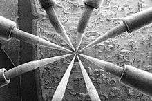 - ↑ Gong, Z.; Chen, B. K.; Liu, J.; Sun, Y. (2013). "Automated nanoprobing under scanning electron microscopy". 2013 IEEE International Conference on Robotics and Automation. p. 1433. doi:10.1109/ICRA.2013.6630759. ISBN 978-1-4673-5643-5.