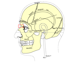The nasion (nā′zē än′) is the intersection of the frontal bone and two nasal bones of the human skull. Its manifestation on the visible surface of the face is a distinctly depressed area directly between the eyes, just superior to the bridge of the nose.[1] It is a cephalometric landmark that is just inferior to the glabella.