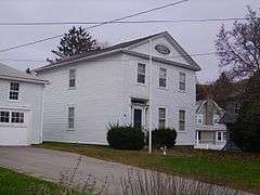 The house originally stood on Broadway Street in the center of Norwich, Connecticut. It was originally Colonial at its time of construction, but has been modified to Greek Revival style.[2] The renovation itself may date to around 1825.[5][note 1] The house is a white two-story clapboarded structure with its gable end facing the street. The three-bay facade faces south and the front entrance is located on the left bay. The eaves cornice is decorated with mutules that span the length of the gable ends and combines with the roof cornice to make a pediment that encloses an elliptical window in the center. The window is of the "rising sun pattern" with glass panes radiating out through two rings. The entrance on the left of the facade has a paneled door, stated to be original, that is enclosed in a rectangular frame, supported by Ionic columns and framed by fluted moldings. The frames of the 6-over-6 windows project slightly from the clapboard exterior. The foundation and steps to the house is of stone.[2]