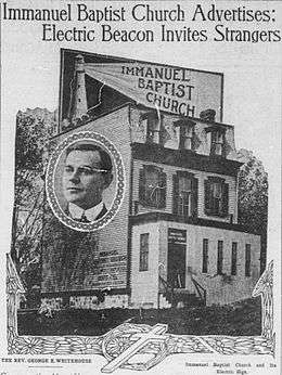- 1 2 "Immanuel Baptist Church Advertises: Electric Beacon Invites Strangers; Congregation About Two Years Old Has Bought $30,000 Lot". Washington Times (4,868). Washington, D.C. 13 October 1907. p. 11 – via Chronicling America: Historic American Newspapers, Library of Congress.