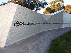 National Emergency Services Memorial, Canberra: west face (detail). High Court of Australia building at far right, across Lake Burley Griffin.