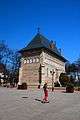 The freestanding entrance tower located to the northwest of the church and nicknamed Stephen's Tower (turnul lui Ștefan), is in relatively good condition, without major modifications since it was built. Described by architectural historian Grigore Ionescu as "much more elegant, better proportioned and richer in valuable architectural details than that of Bistrița Monastery", the tower was built in 1499, a year after the church was dedicated, as attested by an inscription on its eastern wall. Its main purpose was and is as a bell tower, but it also played a secondary role as observation tower,[4] allowing guards to watch over the Bistrița River and the roads leading to the Neamț Citadel and Roman, picking out enemies and seeking refuge from them.[2][5] It is 19 m high and 5.8 m wide, with a square base for the first 7 m (up to the second level) and becoming an octagonal prism higher up.[2][5] The structure is made of dry stone interlaced with a few rows of brick.[4] The angles of the prism as well as the buttresses, which extend for several meters, are of polished stone.[5] In certain places, the flat corner blocks of stone still preserve little discs of glazed and colored terracotta. These were affixed onto holes left in the stones by the grips used to lift them up the scaffold, at the same time enriching the decor of the facade.[4]