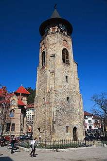 The basement room has a vaulted ceiling and is sealed off. The ground floor is also vaulted, has two small windows in the southern and western walls, and is entered straight through a door on the western side. The next floor was formerly accessed by a ladder, replaced by a metal staircase; higher up, there is an interior stairway up to the bell chamber.[5] This room contains trace elements of arches that suggest a hemispherical ceiling.[4] There are four bells: a large one from the 17th century, producing a special tone; another from the 19th century; and two from 1979. A level was added to the tower in the mid-19th century, providing a lookout for fires. An 1847 engraving by Gheorghe Asachi shows no upper deck, but this was certainly in place by 1861, when a public subscription was opened for purchasing and mounting a giant clock. The first clock was possibly brought from Vienna in 1861, but other accounts indicate the clock was manufactured there in 1888 and donated in 1890.[5] Although no longer the tallest structure in Piatra Neamţ, the tower remains a symbol of the city.[4]