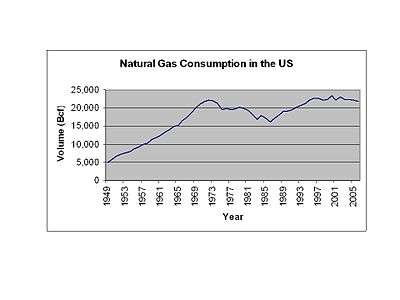 The chart shows a 75-year history of annual United States natural gas production and average wellhead prices from 1930 through 2005. Prices paid by consumers were increased above those levels by processing and distribution costs. Production is shown in billions of cubic meters per year, and average wellhead pricing is shown in United States dollars per thousand cubic meters, adjusted to spring, 2006, by the U.S. Consumer Price Index.[15][16][17][18][19]