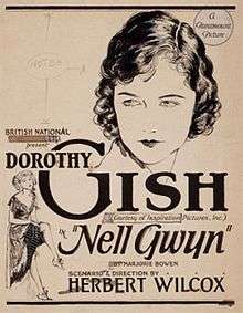 Nell Gwyn is a 1926 British romance film directed by Herbert Wilcox and starring Dorothy Gish, Randle Ayrton and Juliette Compton.[1] It was based on the 1926 novel Mistress Nell Gwyn by Marjorie Bowen[2] and follows the life of Nell Gwynne the mistress of Charles II. Wilcox later made a second version of the film in 1934 Nell Gwynn which starred Anna Neagle.[3]