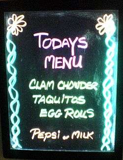 A neon (or glass) message board or glassboard is an erasable luminescent whiteboard-like writing pad that enables users to leave messages for others. They have been a common way of displaying daily specials at restaurants. Colored fluorescent non-permanent wet wipe markers are used to write notes, messages or menus on the board, which is illuminated from the edge by a fluorescent light, usually a blacklight tube.