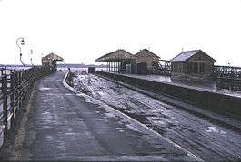 From 1923 the pier and station were closed for reconstruction, reopening on 19 March 1928.[18][19] The station gave the appearance of having two platforms with a siding between, but the western "platform" was a wooden roadway used by vehicles to and from ferries, passengers used the true platform on the eastern side of the pier.[20] The central siding often contained one or two coal wagons from which a small road 'train' of tubs was loaded and taken down the access ramps to ferry steamers.[21] Originally the station had an overall roof but this was later removed.[5][22] The station buildings were made of wood and included a signal box and refreshment rooms on the more substantial eastern side.[23][24]