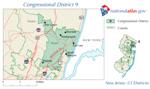 New Jersey's Ninth Congressional District is a district that consists largely of Bergen County and Passaic County municipalities. Due to redistricting following the 2010 Census, parts of the old 9th District were shifted to the Fifth District and the new Eighth District, as part of a reduction in congressional districts from 13 to 12 in New Jersey.