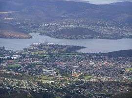 New Town viewed from Lost World to the west. New Town Bay is on the left and Cornelian Bay is on the right behind the suburb. | |||||||||||||
