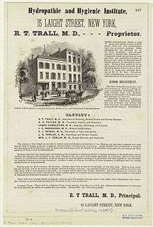 New York Hydropathic and Physiological School was founded by Russell Thatcher Trall, MD on October 1,1853 at 15 Laight Street, in New York City. It is chiefly notable today as one of the first medical schools in the United States to admit women candidates for the Doctor of Medicine degree. New England Female Medical College in Boston was the first, opening its doors in 1848. In 1855 the school graduated 50 physicians, "...about half of which were women."[1] By an act of the New York State Legislature in 1857 the school's name was changed to New York Hygeio-Therapeutic College and the school was authorized to confer the degree of Doctor of Medicine. In 1858 the school graduated another 60 physicians, and again the number of female graduates was about half that number.[2][3]