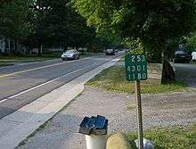 Reference marker for NY 253 on Five Mile Line Road, a remnant of its former routing in Penfield