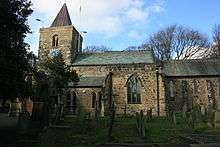 St Michael and All Angel's church was built in a commanding position above the village on the site of an earlier wooden built church, which was burned down in 1067. Osulf II of Bamburgh attacked Copsi, an appointee of William the Conqueror, setting the church alight and slaying Copsi when he emerged from its door.[6] The current church was built over the course of 30 years, beginning in 1070. Parts of Hadrian's Wall were used in its construction. The church was damaged in another fire in 2006, but the current tower has stood since 1100.[6][18] In the early twentieth century, the Newburn Wesleyan Church was built.[3] This has since been demolished.