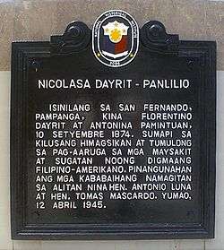 Nicolasa Pamintuan Dayrit-Panlilio (1874–1945) was a Philippine non-combatant in the Philippine-American War. Her actions not only included helping to minister the sick and wounded Philippine combatants, but also played a major role in appeasing General Antonio Luna during his confrontation with General Tomas Mascardo. This contributed to the collapse of the Bagbag-Quingua-Sta. Maria defense line based on the Pampanga River, which was held against the American forces.