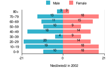 According to the 2002 Poland census, there were 226 people residing in Niedźwiedź village, of whom 47.8% were male and 52.2% were female. In the village, the population was spread out with 25.7% under the age of 18, 29.6% from 18 to 44, 19% from 45 to 64, and 25.7% who were 65 years of age or older.[1]