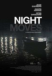Night Moves is a 2013 American drama film directed by Kelly Reichardt and written by Reichardt and Jonathan Raymond, starring Jesse Eisenberg, Dakota Fanning, Peter Sarsgaard, Alia Shawkat, and James LeGros. The film follows three radical environmentalists who plot to blow up a dam. It was shown in the main competition section of the 70th Venice International Film Festival,[3][4] at the 2013 Toronto International Film Festival[5] and at 2013 Deauville American Film Festival, where it won Grand Prix of the festival.[6]