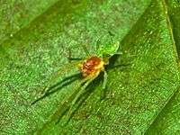 Nigma walckenaeri is a green cribellate spider up to five millimetres long, the largest of the family Dictynidae. While most of the body is a somewhat yellowish, the abdomen is a shining green, which makes it rather distinct and hard to confuse with other species. The green color makes it almost invisible. Males have an elevated head region. From August to October these spiders can be found in gardens or on walls - often on big leaves such as lilac or feral grapevine. The spider catches insects, sometimes larger than itself, in its web, which it builds on the surface of leaves. The female hides the 7-millimetre long egg sac on a place distant from its retreat.