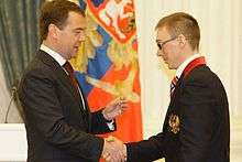 ![]() Polukhin (right) is awarded the Order of Friendship[1] by Russian President Dmitry Medvedev in 2010. | |||||||||||||||||||||||||||||||