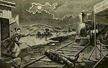 - Under the Gaslight (1868), was one of the first of many plays to use a steam engine onstage while the hero was being tied to the railway tracks. “Despite the fact that, on the first night, the machinery of the great railroad scene failed to work properly, the audience was held in tense excitement, and the play from the outset was a success” It ran for 110 performances.[23] The mechanical effects involved are said to have been patented by Augustin Daly.