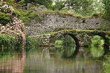 The garden is crossed by numerous small springs as well as the river Ninfa, which flows south of the garden. Restoration of the garden involved importing plant species from all over the world.[14] There are over a thousand varieties of plants and trees, such as American walnuts, several ornamental apples, yuccas, Cotinus coggygria, catalpa, cedar trees and many rose bushes, including multicoloured Rosa x odorata 'Mutabilis', the early yellow Rosa hugonis, and the pale pink 'Complicata'. Cultivars grown include the white 'Iceberg', red 'Max Graf', and the following hybrid musk roses: the cream coloured 'Penelope', pink 'Ballerina' and buff coloured 'Buff Beauty'. Many climbing roses are also grown in the garden, including Rosa banksiae, Rosa bracteata, Rosa filipes 'Kiftsgate', known for its vigor and beautiful foliage, the white Rosa 'Mme. Alfred Carriére' and the apricot climbing rose 'Gloire de Dijon'. Along the main avenue are cypresses, weeping cherry trees, Himalayan pine, banana trees, Mexican pine and lavender. The rock garden contains Iberis, Eschscholzia, Veronica, golden alyssum (Alyssum saxatile), Aquilegia, Dianthus and pomegranates. Purple flowered Clematis armandii, climbing hydrangea (Hydrangea petiolaris), and poplars grow near the bridge; along the river there are groves of hazelnut trees, Acer saccharinum and Liriodendron tulipifera.[15] Near the bridges are maples, poplars, Photinia serrulata, Gunnera manicata, papyrus, Casuarina tenuissima, jasmine, climbing hydrangea, purple flowered Clematis armandii, wisteria, Liriodendron tulipifera, cedars, wattle and a clump of bamboo from China. Magnolia stellata grows in front of the castle.
