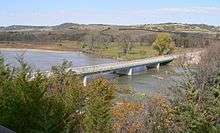 | The Niobrara at its confluence with the Missouri. The Niobrara runs from lower right to upper left, under the bridge in the photo; the Missouri is in the background, flowing from left to right. | |