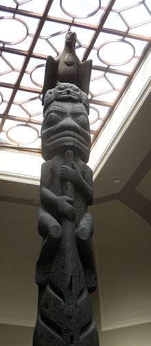 The Nisga'a and Haida Crest Poles of the Royal Ontario Museum are a collection of four large totem poles (sometimes referred to as "crest poles"), hand carved from western red cedar by the Nisga’a people and Haida people of British Columbia's coast. The poles are referred to as: Three Persons Along (Nisga'a); the Pole of Sag̱aw̓een (Nisga'a); the Shaking Pole of Kw’ax̱suu (Nisga'a); House 16: Strong House Pole (Haida). Each of the crest poles tell a family story, as carved figures represent crests that commemorate family history by describing family origins, achievements and experiences.[1] These memorial poles were typically placed in front of the owners' house along the beach.[2]