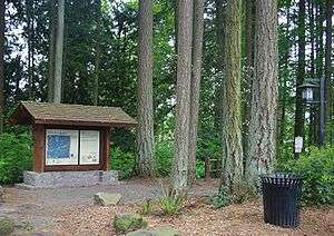 Terrestrial wildlife includes beavers, tree frogs, and raccoons among others.[11] Additionally, the park is home to some bats.[12] Aquatic life in the creek includes crawfish, freshwater mussels, and some smaller fish.[10] Snowberry, Pacific dogwood, Douglas fir, red cedar, nightshade, alder, western hemlock, ash, rose hips, red osier dogwood bushes, ninebark, bittersweet nightshade, jewelweed, and maples make up the various plant species at the park.[9][10][11] Some of the cedar trees are more than a century old.[6]