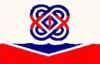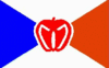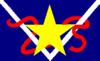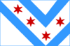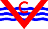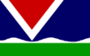 The association's flag consists of a large white "V" (an inverted chevron) separating a blue triangle above from two red triangles on either side. The length of the top side of the blue triangle is the same as the width of the flag. (Note that a flag's "width" is its vertical dimension when flying from a flagpole.) The flag proportion is 2:3.