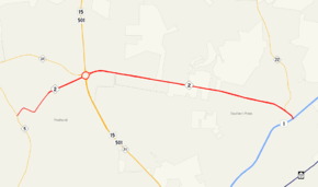 NC 2 begins at an intersection with NC 5 (Beulah Hill Road), just south of downtown Pinehurst. The route follows Cherokee Road to the northeast through a residential section of the town before meeting a traffic circle. Continuing across the circle the road continues to follow Cherokee Street until meeting Azalea Road. At the intersection the street name changes to Azalea Road, and begins a turn toward the southeast. NC 2 turns northeast onto Palmetto Road near the Pinehurst Golf Course. It continues to follow Palmetto Road along the western side of the golf course. Palmetto Road turns slightly to the northeast before widening to a 4 lane road and becoming Midland Road. NC 2 meets up with US 15-501 and NC 211 at a traffic circle east of a shopping district. The road continues straight across the circle and continues on Midland Road. Midland Road crosses through a residential area west of Pinehurst before entering into the town of Southern Pines. NC 2 turns to the southeast before intersecting the southern terminus of NC 22 at Central Drive. The road then crosses McDeeds Creek before reaching its eastern terminus at an interchange with US 1.[1][2]