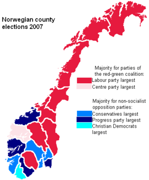 Country-wide local elections for seats in municipality and county councils were held throughout Norway on September 10, 2007, with some areas polling on September 9 as well. For most places this meant that two elections, the municipal elections and the county elections ran concurrently. In addition, several municipalities held direct mayoral elections.