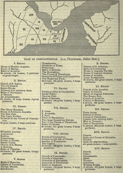 The Notitia Urbis Constantinopolitanae is an ancient "regionary", i.e., a list of monuments, public buildings and civil officials in Constantinople during the mid-5th century (between 425 and the 440s), during the reign of the emperor Theodosius II. The text lists the fourteen regions in which Constantinople was divided, along with the major public buildings such as fora, theatres, churches, palaces, baths and pools. It also lists the number of "houses" (domus), although there is uncertainty over the exact meaning of the term. Finally, the list includes the civil officials of each region, including the curators, the heads of the associations (collegia) and the heads of neighbourhoods (vicomagistri).