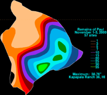 On the island of Hawaii, more commonly referred to as "the Big Island", roughly the entire eastern half of the island experienced rainfall of at least 10 in (254 mm), while the western side reported generally less than 5 in (127 mm) or less.[2] A station in Hilo reported 27.2 in (690 mm) in a 24‑hour period, breaking the record set in February 1979 by more than 4 in (100 mm). Additionally, 16.2 in (410 mm) was recorded on November 2, which set the new calendar day total for the month of November, surpassing the previous total of 15.4 in (390 mm) on November 18, 1990.[3] Near Ka Lae, the southernmost point in the United States, rainfall reached nearly 5 in (127 mm). Rainfall peaked at an extreme amount of 38.76 in (985 mm) at Kapapala Ranch.[2] In addition, the 24 hour rainfall total reached 37 in (940 mm), which is just 1 in (25 mm) shy of the record amount of precipitation in the state of Hawaii set on January 25, 1956.[4] That total was the second-highest tropical cyclone-related rainfall total in the state, although well behind Hurricane Hiki of 1950, which dropped 52 in (1321 mm).[5]