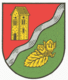 The German blazon reads: Von Rot und Grün durch einen silbernen Schräglinkswellenbalken geteilt, oben ein goldener Glockenturm, unten ein goldener Haselnusszweig mit zwei Haselnüssen und einem Blatt.