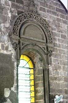The church is a mixture of different architecture styles. An example of this is the façade which shows Neo-Romanesque-Gothic style.[4] The massive buttresses create a vertical movement, stopped only by the roundness of windows, statues, niches and the semi-circular arch of the main entrance. The missing old monastery to which it was attached on the left sets the façade somehow off balance. Two sets of Doric columns support the cornice and the triangular pediment. Leaf carvings above the main recessed entrance, niches, windows and around the tympanum lightens the massive character of the structure which have touches of the Baroque. A string course of arabesque designs runs along the architrave.[5]