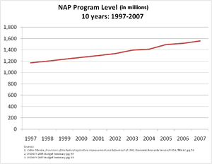 The new block grant program differed significantly from the former Food Stamp program in three major ways.[17] First, the new NAP program was designed to distribute the benefits through physical cheques, ensuring that the benefit would be payable only to the beneficiary while at the same time reducing administrative costs,[5] since the former physical vouchers (cupones in Spanish) were subject to storage and accountability problems, theft, counterfeiting and even trafficking.[5][18] Second, the benefits were no longer restricted to vouchers redeemable only for food, but were provided in cash. The beneficiary could then elect to purchase a product or select services other than food.<ref">FANRR-19-3, Chapter 11, pg. 286, par. 7</ref> Third, the overall assistance provided to Puerto Rico was limited to an annual block appropriation, requiring the Puerto Rican government to adjust its program management to allocate the funds.[19] Between 1982 and 1986, the U.S. Congress awarded $825 million annually in block grants for NAP program, and since then the appropriations have steadily increased by an estimated 3% to 4% to compensate for inflation.[16] It has surpassed $1 billion annually since the early 1990s, and increased 30% from 1993 to 2002.[4] Since fiscal year 2006, the appropriation has reached over $1.5 billion annually.[2]