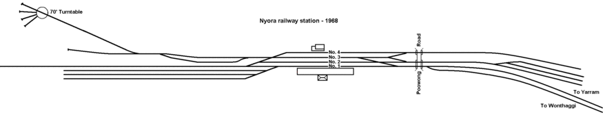 The station contains a nearly fully operational turntable (currently undergoing repairs). Nyora was the final station on the line from Melbourne before the Wonthaggi line branched off from the main South Gippsland (Port Albert / Woodside) line.
