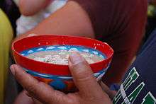 Though most chocolate is consumed as a hot beverage, it is also an important ingredient in a cold beverage called tejate. It is made with fermented corn, cacao, and the seed of the mamey fruit. It is traditionally served in dried and painted gourds.[12] Tejate is usually found in the towns just outside the city of Oaxaca. It is similar to the pozol of Chiapas. The drink was previously considered a complete meal.[9] However, tejate is becoming less common and harder to find.[13]