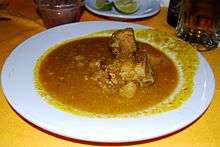 The name, color and ingredients distinguish the seven main moles of Oaxaca, called negro (black), amarillo (yellow), coloradito (colored), mancha manteles (tablecloth stainer), chichilo (named after the main pepper), rojo (red) and verde (green).[14] All of the moles, except verde, can be kept as a paste and cooked later diluted with chicken broth.[2] Mole negro is the best known and most complicated of the preparation, containing anywhere from twenty to thirty-plus ingredients, depending on the recipe.[2][13] Mole negro is slightly sweet, black in color and contains six different types of chili peppers, plantains, onion, tomatoes, tomatillos, cloves, cinnamon, chocolate, nuts, tortillas, avocado leaves and more depending on the recipe. To gain the desired black color, the chili peppers have to be well toasted but not burnt. Mole amarillo contains green tomatoes, onion, garlic, cumin, cloves, ancho chili peppers, guajillo chili peppers, hoja santa or cilantro and is garnished with onions, lime and oregano. Mole coloradito is brick red in color and contains ancho chili peppers, tomatoes, garlic, sesame seeds, almonds, cinnamon and oregano. Mancha mantales is red and uses ancho chili peppers, tomatoes, garlic, onion, thyme, cloves and almonds. Another red mole is chichilo, which uses chihuacle, negro, pasilla and mulato chile peppers, tomatoes, marjoram, allspice, cloves and avocado leaves. Rojo is red as its name suggests with ingredients such as chocolate, guajillo chili peppers, onion, tomatoes, garlic, oregano, nuts and sesame seeds. Mole verde contains tomatillos, green chili peppers, onion, garlic, cumin, cloves, ancho and guajillo chili peppers, hoja santa, epazote and parsley. It has a light and herby taste.[2][14] Of the sauces, verde is the easiest to create as it does not require the toasting and rehydration of chili peppers.[14]