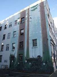 The south side of the building has a Trompe-l'œil of "The Honeymooners" – depicting two characters from the television show The Honeymooners – and a Pacific Northwest temperate rainforest mural painted by Robert Scott Dobie, a Vancouver Island-born artist.[2] The mural is 40' wide x 65' tall and is painted with acrylic resin on stucco.