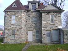 The exterior of the house is built with glaciated deposited bedrock stones. It would be characterized as ashlar stonework, even though it started as heterogeneous mix of "fieldstones" (not one type of stone) like rubble masonry. This sort of stone building construction is common in the glaciated areas of the United States. The sedimentary rock construction material was obtained from an assortment of bedrock in western Michigan . The igneous rock and metamorphic rock used in the construction came from Canada. The rock material was hewn to give flat surfaces on the outside. The sedimentary stone material is not especially hard, so could have been hammered smooth flat without to much trouble. However, the igneous rock and metamorphic rock are very hard and difficult to break. It was a very laborious chore to work this rock material to a flat smooth finish. Usually these hard rocks are used unbroken and typically in retaining walls and building foundations.[5]
