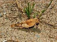 Oedipoda germanica, the 'Red-winged Grasshopper', is a species of 'short-horned grasshoppers' belonging to the family Acrididae subfamily Oedipodinae.
