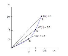 The offer curve is derived from the country's PPF. We describe a Country named K which enjoys both goods Y and X. It is slightly better at producing good X, but wants to consume both goods. It wants to consume at point C or higher (above the PPF). Country K starts in Autarky at point C. At point C, country K can produce (and consume) 3 Y for 5 X. As trade begins with another country, and country K begins to specialize in producing good X. When it produces at point B, it can trade with the other country and consume at point S. We now look at our Offer curve and draw a ray at the level 5 Y for 7 X. When full specialization occurs, K then produces at point A, trades and then consumes at point T. The price has reduced to 1 Y for 1 X, and the economy is now at equilibrium