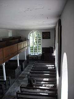 The interior has a flat plaster ceiling.[2] The walls are whitewashed and the church is floored with stone flags.[6] There are galleries on the north and west sides, carried on Tuscan-style columns, and on the ground floor there are fixed simple oak benches, box pews (one of which carries the date 1719), and a two-decker pulpit. The sandstone font dates from the 18th century and is in the shape of an urn.[2] At the east end of the church, to the right of the large east window, in the form of a hatchment, are the Royal coat of arms of King George I dated 1719.[6]