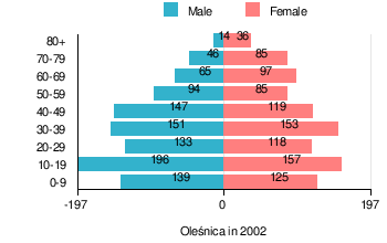 According to the 2002 Poland census, there were 1,961 people residing in Oleśnica village, of whom 50.2% were male and 49.8% were female. In the village, the population was spread out with 28.5% under the age of 18, 38.6% from 18 to 44, 17% from 45 to 64, and 16% who were 65 years of age or older.[1]