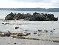 The layered sandstones and siltstones (mudstones) are seen in the cliff faces and also form the shore platform around the north and west sides of the park. These softer, generally yellow-brown rocks are approximately 19-20 million years old and are made up of the Waitamata formation (East Coast Bays facies) of early Miocene (Late Otaian) age.[14] Distortion and faulted dipping, of this once soft strata, can be seen both in the cliffs and in the small ridges of the rock platform extending out from the beach at low tide.