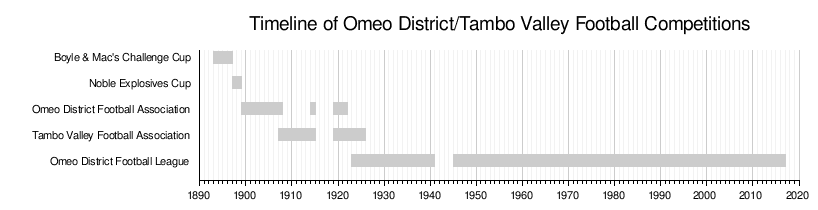 - 1893: The first recorded football competition in the Omeo District, the Boyle and Mac's Challenge Cup was formed, consisting of Long Gully (Cassilis), Omeo, and Swifts Creek. Swifts Creek won the first 'cup'.[3][10]