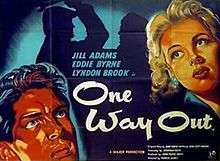 One Way Out is a 1955 British crime drama film directed by Francis Searle and starring Jill Adams, Eddie Byrne, Lyndon Brook, John Chandos and Arthur Lowe.[1] The art direction was by William Kellner.[2] This second feature was released in the UK as the supporting film to the Norman Wisdom comedy Man of the Moment.[2]