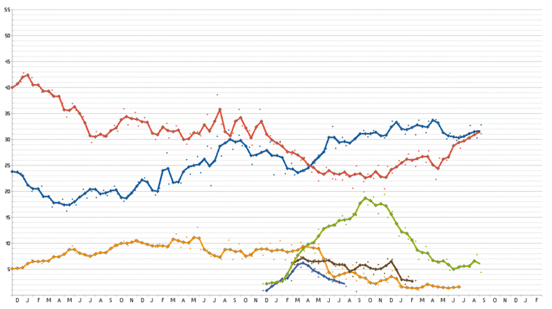 15-day average trend line of poll results from December 2011 to present, with each line corresponding to a political party.