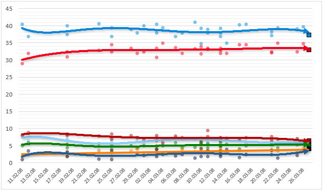 | 17–21 Mar | Euromedia | 32.2 | 38.3 | 5.1 | 7.8 | 5.5 | 3.8 | 2.5 | 4.8 | 6.1 |